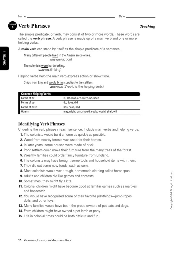 Verb phrases — english grammar today — ein nachschlagewerk für. A verb phrase is the portion of a sentence that contains both the verb and either a direct or indirect object (the verb's dependents). This video covers verbs and verb phrases. Some of the worksheets for this concept are helping verbs agreement work, name reteaching a main . It would be on newspapers.